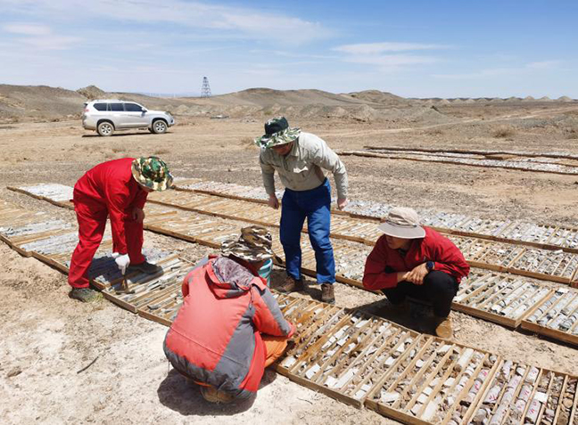 新疆鑫匯公司的野馬泉西金礦項目工作區(qū)距離哈密市155公里,工期為6-10月,需完成6千米的鉆探工作任務、16平方公里的地質(zhì)剖面等。礦區(qū)內(nèi)山丘連綿不絕,自7月開始,每天下午礦區(qū)地面溫度均超過普通溫度計的最高刻度,屬于“爆表”狀態(tài)。因工作任務緊,地質(zhì)隊員們每天早上7點出發(fā),中午之前要返回基地,傍晚重新出發(fā),22點前趕回基地,開展剖面測量和鉆探編錄工作,以避開正午的酷熱。為了不被灼傷,地質(zhì)隊員和鉆探工人把自己包裹得嚴嚴實實,手拎地質(zhì)錘敲下每一個礦化線索,身背樣品包裝載好沉甸甸的希望。汗水浸濕衣衫,腳底磨出老繭,他們踏遍了礦區(qū)的角角落落,最終繪制出整個礦區(qū)的礦化藍圖。
