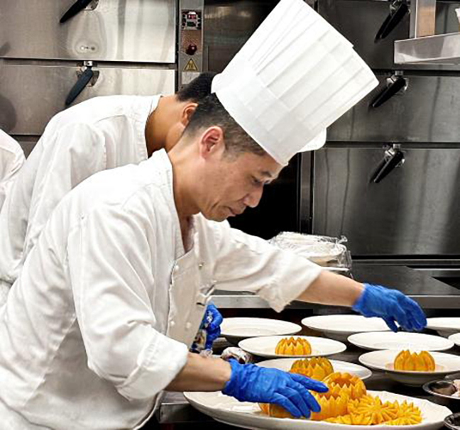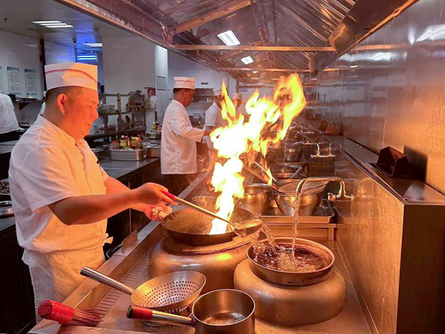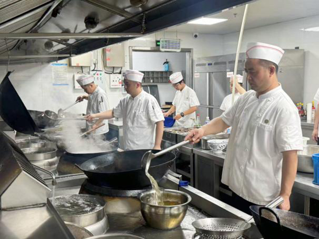 在鹽城迎賓館、國投大酒店、鹽城萬豪酒店,后廚內(nèi)各類蒸煮設備持續(xù)釋放出熱氣。為了客人味蕾的享受,在高達四五十攝氏度的廚房里,廚師們在灶臺前忙活,耐心細致地烹飪著每一道菜肴,洗鍋、倒油、下主料、添配菜,他們一手端著鐵鍋,一手用力翻炒,炙熱的火焰不時從鍋中竄出。對于廚師來說,每年7月到9月都是一場漫長的考驗,由于大部分后廚油煙大,不適合安裝空調(diào),用大功率風扇又會影響烹飪,所以廚師們的工作服幾乎都是濕的,而正是因為有了他們在高溫下的執(zhí)著堅守,才有了滿足人們味蕾的美味菜肴。